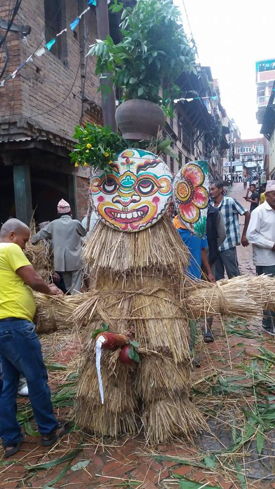 टोलटोलमा स्थानीयस्तरमा नर्कट, छ्वाली, पराल संकलन गरी संकलित नर्कट, छ्वालीबाट तीनखुटे गथामग बनाइन्छ । घरमा फाल्नुपर्ने पुरानो नाङ्लोमा मुख, नाक, कानलगायतका ज्ञानेन्द्रिय अंग लेखी हाँंडीको टाउको दिइएको हुन्छ ।
