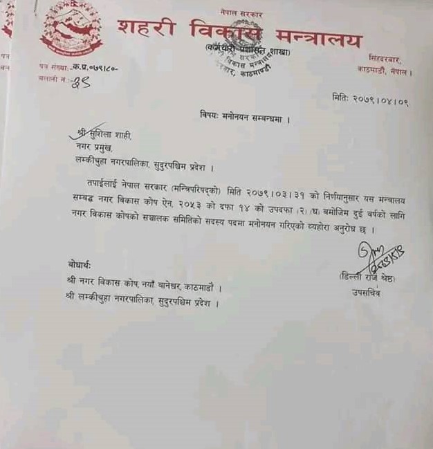 काठमाडौं । कैलालीको लम्कीचुहा नगरपालिकाकी नगरप्रमुख सुशिला शाही नगर विकास कोषको सञ्चालक समिति सदस्य मनोनीत भएकी छन् ।