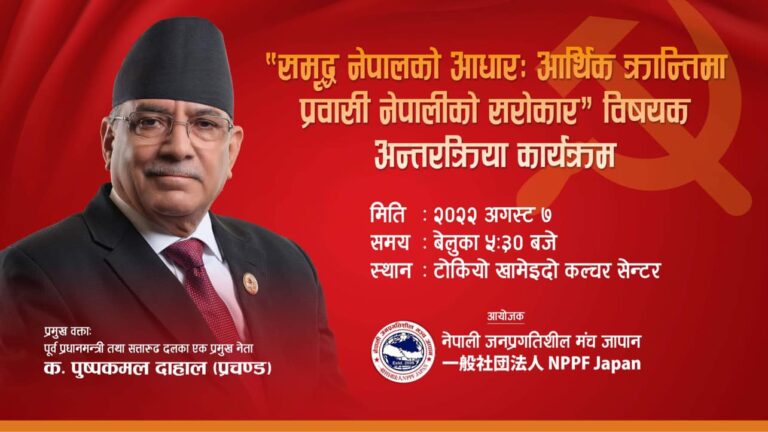 प्रचण्डले टोकियोमा ‘समृद्ध नेपालको आधार आर्थिक क्रान्तिमा प्रवासी नेपालीको सरोकार’ विषयक अन्तरक्रिया कार्यक्रमलाई सम्बोधन गर्ने भएका छन् ।