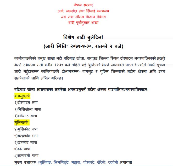 खोला थुनिँदा बनेको ताल जतिसुकै बेला फुट्न सक्ने अवस्था रहेकाले गुल्मी र बाग्लुङस्थित बढिगाडखोलाको किनारमा बस्ने नागरिकलार्इ अति उच्च सतर्कता अपनाउन बाढी पूर्वानुमान शाखाले बुलेटिन जारी गरेको छ ।