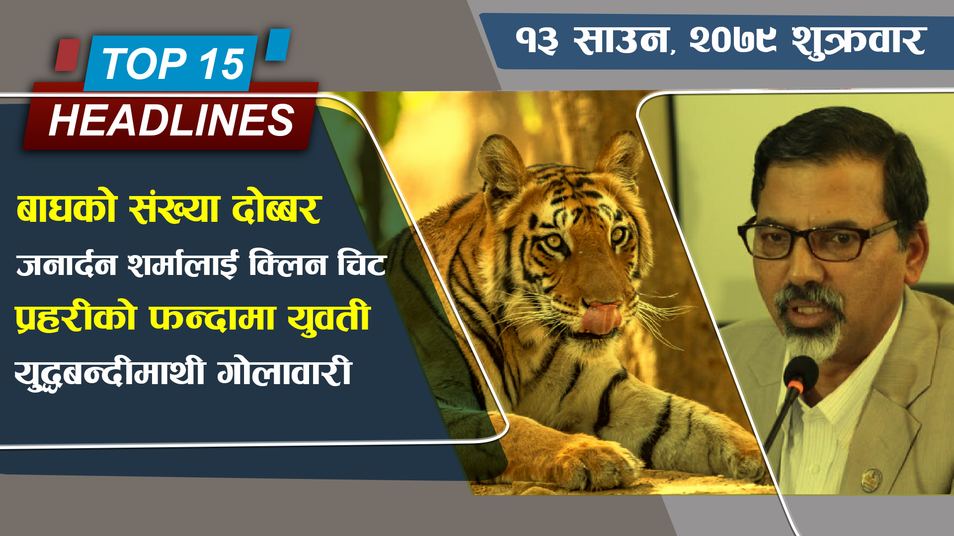 ३  नेपालका ५ वटा राष्ट्रिय निकुञ्जहरुमा बाघको संख्यामा करिब दोब्बरले वृद्धि, सन् २०२२ मा भएको गणनामा बाघको संख्या ३५५ पुग्यो ।