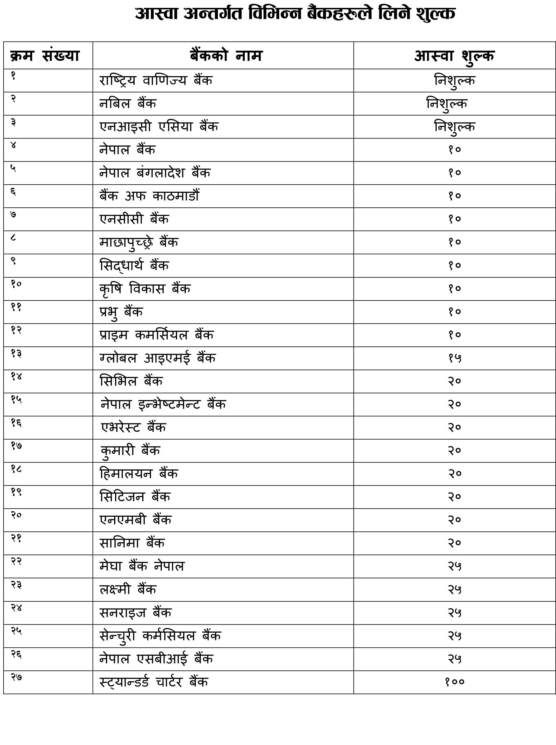 जसअनुसार बैंक तथा वित्तीय संस्थाहरुले ५० हजार रुपैयाँसम्मको दरखास्तमा १०० रुपैयाँसम्म आस्वा शुल्क लिन पाउनेछन् ।