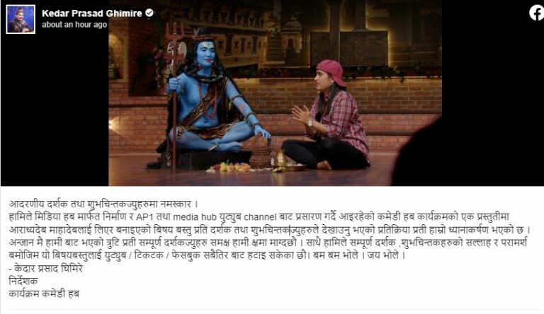 काठमाडौं । हाँस्य टेलिभिजन कार्यक्रम कमेडी हबमा शिवलाई मजाक बनाइएको भन्दै विरोध भएपछि निर्देशक केदार घिमिरे ‘माग्ने बुढा’ले माफी मागेका छन्।