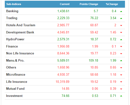 यस दिन पाँच वटा उपसमूहको मात्र सेयरमूल्य बढेको छ भने बाँकी ८ वटा सूचक हरियाली देखिएको छ । सोमबार ब्यापार समूहका लगानीकर्ताले सर्वाधिक कमाएका छन् ।