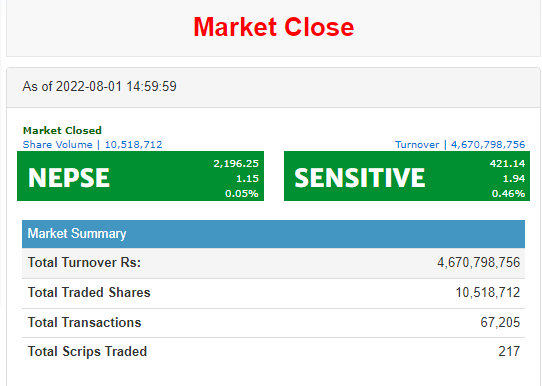 कारोबार अवधिभर २१७ कम्पनीको एक करोड ५ लाख १८ हजार ७१२ कित्ता सेयर ४ अर्ब ६७ करोड ७ लाख ९८ हजार ७५६ रुपैयाँमा किनबेच भएको छ ।