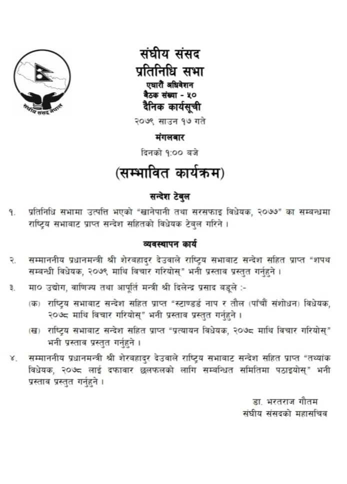 प्रतिनिधि सभा बैठकमा उद्योग वाणिज्य तथा आपूर्तिमन्त्री दिलेन्द्रप्रसाद बडूले राष्ट्रिय सभाबाट सन्देशसहितका प्राप्त ‘स्टाण्डर्ड नाप तथा तौल (पाँचौं संशोधन) विधेयक, २०७८ माथि विचार गरियोस्’ भनी प्रस्ताव प्रस्तुत गर्ने कार्यसूची रहेको छ ।