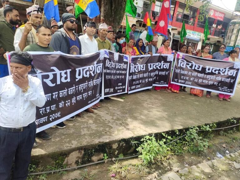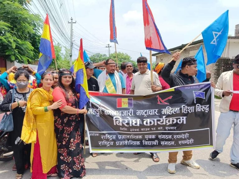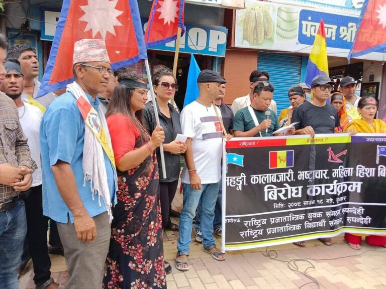 काठमाडौं । राप्रपाले काठमाडौंसहित देशभरका सबै जिल्लामा भ्रष्टाचारविरुद्धमा कालोपट्टी लगाएर विरोध प्रदर्शन गरेको छ । बुधबार पार्टीनिकट सबै जनवर्गीय संगठनको संयुक्त आयोजनामा कालोपट्टी बाँधेर प्रदर्शन भएको राप्रपा प्रवक्ता तथा प्रचार विभाग प्रमुख मोहन श्रेष्ठले जानकारी दिए ।
