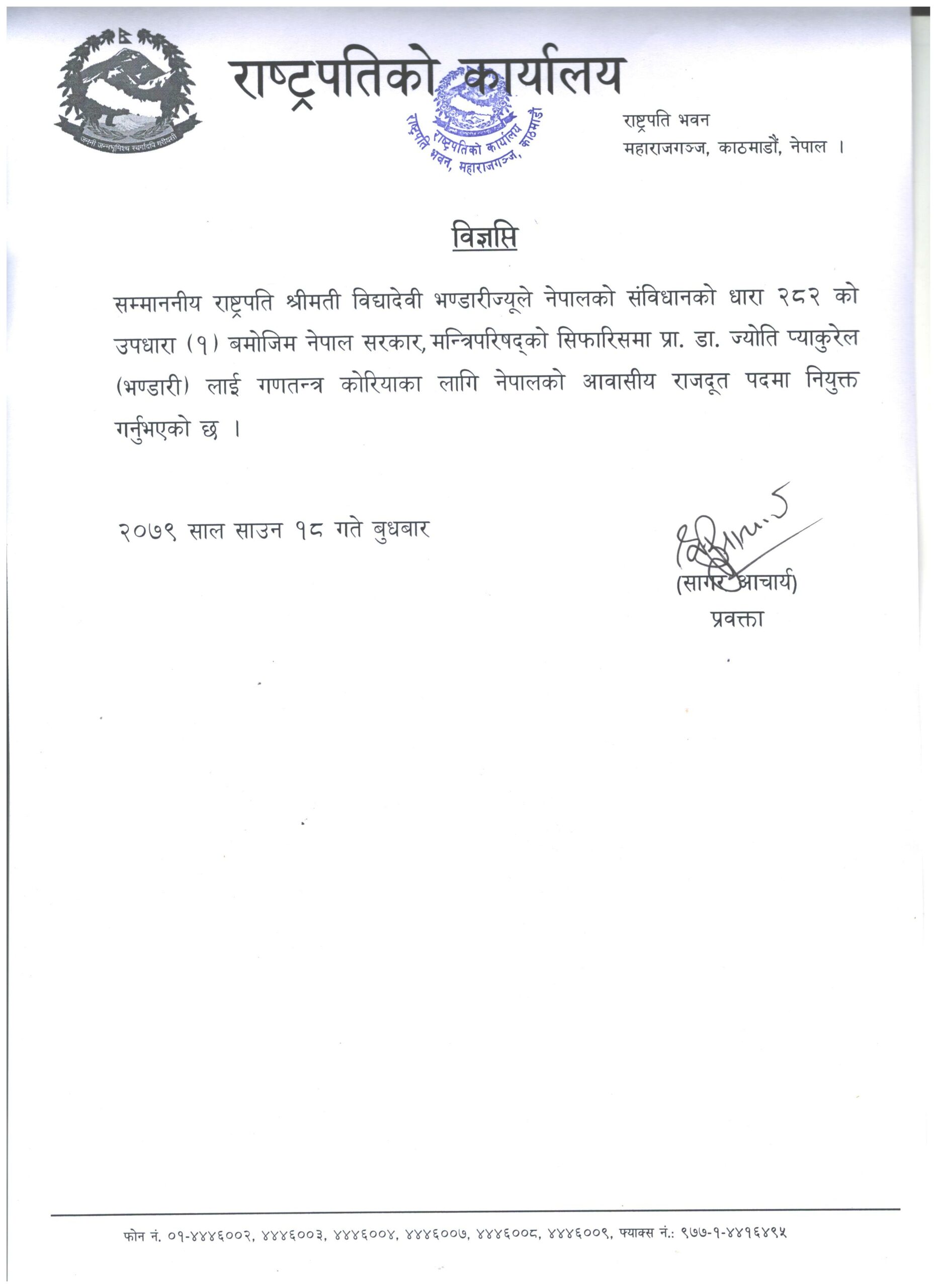 काठमाडौं । दक्षिण कोरियाका लागि नेपाली राजदूतमा प्रा.डा. ज्योति प्याकुरेल नियुक्त भएकी छन् ।