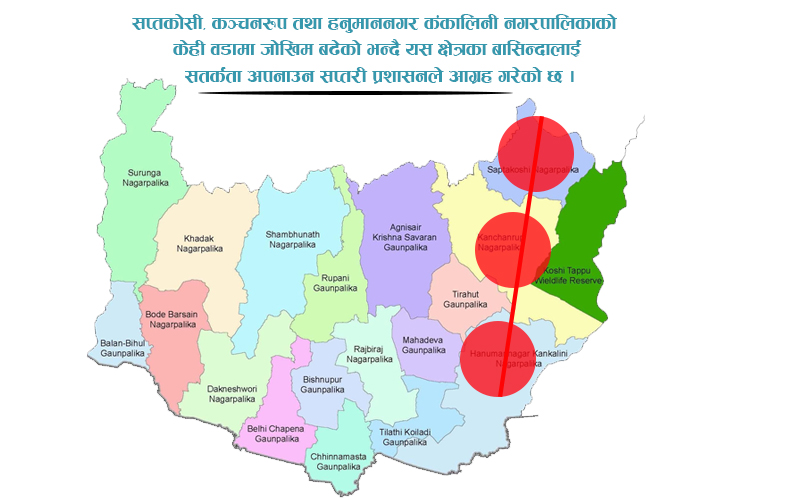 जिल्लाको सप्तकोसी, कञ्चनरुप तथा हनुमाननगर कंकालिनी नगरपालिकाको केही वडामा जोखिम बढेको भन्दै यस क्षेत्रका बासिन्दालाई सतर्कता अपनाउन सप्तरी प्रशासनले आग्रह गरेको छ ।