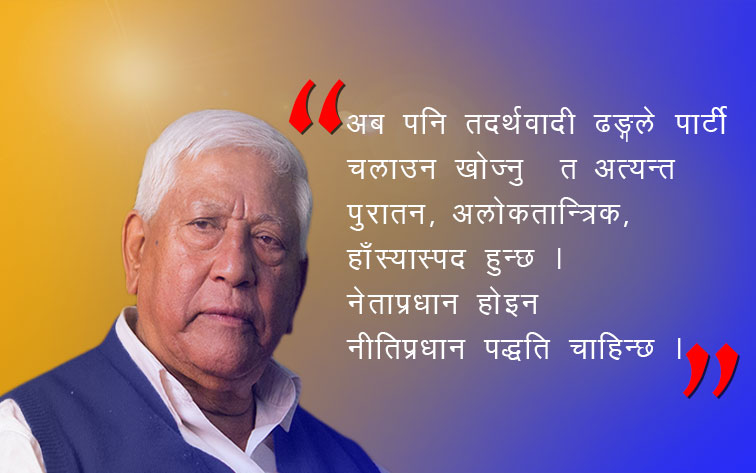 अब पनि त्यही तदर्थवादी ढङ्गले पार्टी चलाउन खोज्नु अत्यन्त पुरातन, अलोकतान्त्रिक तथा हास्यास्पद हुन्छ । नेताप्रधान होइन नीतिप्रधान, व्यक्तिप्रधान होइन विचार तथा संस्थाप्रधान पद्धतिले मात्र आजका चुनौतीलाई सामना गर्न सकिन्छ भन्ने मेरो दृढ मान्यता छ ।