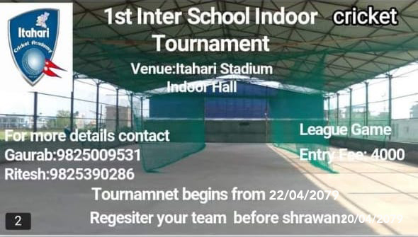 काठमाडौं । इटहरी क्रिकेट एकेडमीको आयोजनामा सुनसरी जिल्लामा पहिलो पटक अन्तरविद्यालय इन्डोर क्रिकेट प्रतियोगिता हुने भएको छ । २२ साउनदेखि हुने प्रतियोगितामा सुनसरी जिल्लाका विद्यालयहरूले सहभागिता जनाउन पाउने आयोजकको भनाइ छ ।