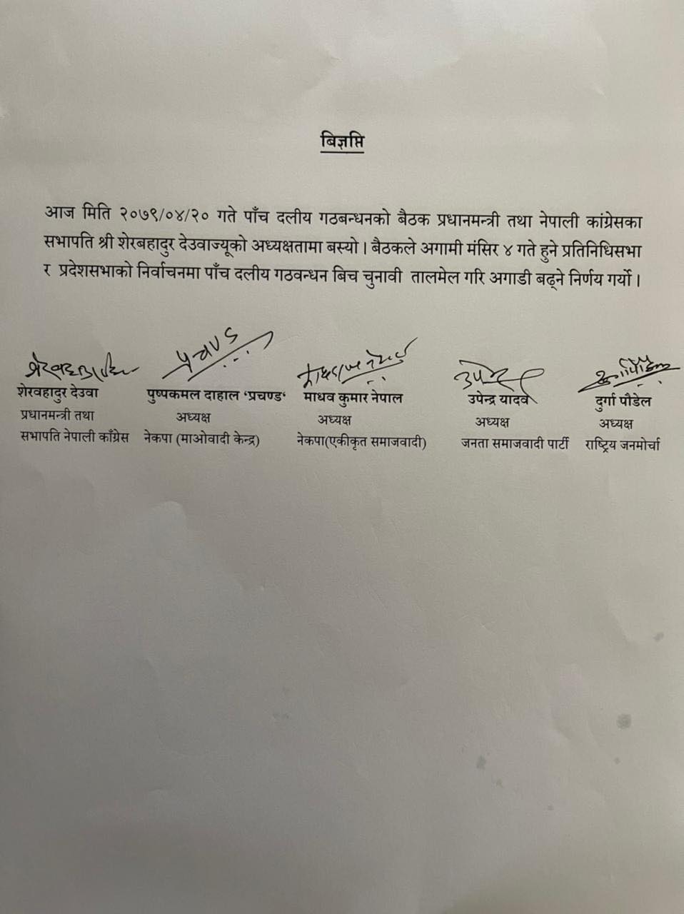 काठमाडौं । आगामी मंसिर ४ गते हुने प्रतिनिधि र प्रदेशसभा निर्वाचनमा चुनाबी तालमेल गर्ने सत्ता गठबन्धनमा सहमति भएको छ । सत्तारुढ पाँच दलीय गठबन्धनको आज (शुक्रबार) बालुवाटारमा बसेको बैठकले यस्तो निर्णय गरेको हो ।