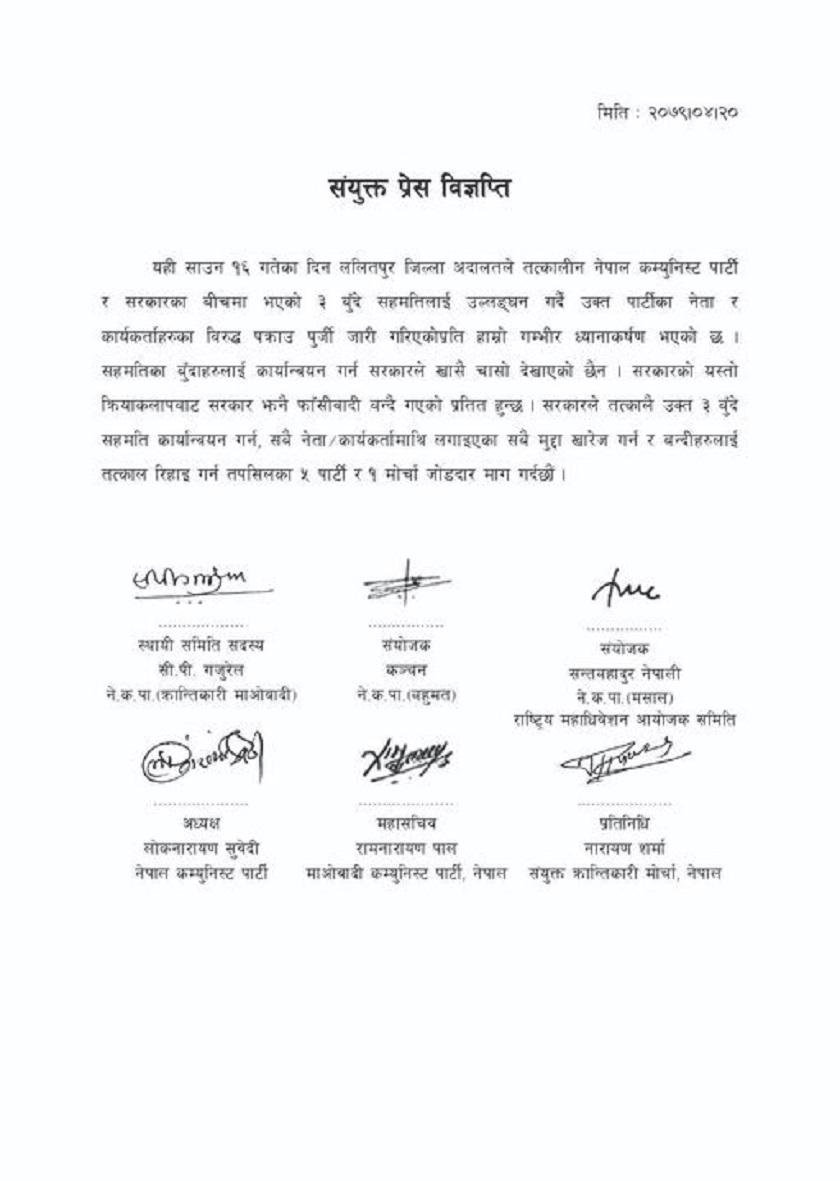 शुक्रबार एक विज्ञप्ति जारी गर्दै ६ दलले सरकारले तीन बुँदे सहमति उल्लंघन गरेको आरोप लगाउँदै फासिवादी चरित्र देखाएको भन्दै आपत्ति जनाएका छन् । नेकपाका महासचिव नेत्रविक्रम चन्द ‘विप्लव’, प्रवक्ता खड्गबहादुर विश्वकर्मासहित नेकपा बहुमतका संयोजक धर्मेन्द्र बास्तोला, प्रवक्ता हेमन्तप्रकाश ओलीलाई जिल्ला अदालतले पक्राउ पुर्जी जारी गरेकोप्रति उनीहरुले आपत्ति जनाएका हुन् ।