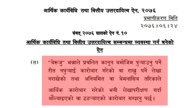 कानुनबाहिरको आर्थिक कारोबारलाई बेरुजु मानिन्छ । आर्थिक कार्यविधि तथा वित्तीय उत्तरदायित्व ऐन २०७६ अनुसार ‘बेरुजु भन्नाले प्रचलित कानुन बमोजिम पुर्याउनुपर्ने रीत नपुर्याई कारोबार गरेको वा राख्नुपर्ने लेखा नराखेको तथा अनियमित वा बेमनासिब तरिकाले आर्थिक कारोबार गरेको भनी लेखा परीक्षण गर्दा औंल्याइएको वा ठहर्याइएको कारोबार सम्झनुपर्छ ।’