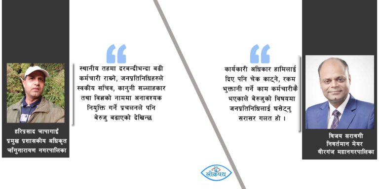 केहिदिन अघि मात्र कतीपय पालिकाले करारका कर्मचारीलाई साउन १ गतेदेखि लागु हुने गरी हाजिरी गर्न नदिने निर्णय गरिसकेका छन् । अब ती रिक्त स्थानमा नेपाल सरकारले पदपूर्ती गर्ने त कुनै सम्भावना नै छैन । केही महिना पछि ती रिक्त स्थान फेरी आफ्नै पार्टीका कार्यकर्ता भरीने छन् । अनी उनीहरुले लिएका तलब फेरी बेरुजुकै भकारीमा थुप्रिने पक्का छ ।असारे