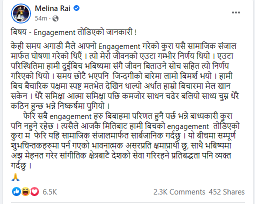 उनी भन्छिन्, ‘केही समय अगाडि मैले आफ्नो इन्गेजमेन्ट गरेको कुरा यसै सामाजिक संजालमार्फत घोषणा गरेको थिएँ । त्यो मेरो जीवनको एउटा गम्भीर निर्णय थियो । एउटा परिस्थितिमा हामी दुईबीच भविष्यमासँगै जीवन बिताउने सोचसहित त्यो निर्णय गरिएको थियो । समय छोटै भएपनि जिन्दगीको बारेमा लामो विमर्श भयो । हामीबीच बैचारिक पक्षमा स्पष्ट मतभेत देखिन थाल्यो अर्थात हाम्रो बिचारमा मेल खान सकेन । धेरै समीक्षा आत्मासमीक्षापछि कमजोर साधन चढेर बलियो साध्य चुम्न धेरै कठिन हुन्छ भन्ने निष्कर्षमा पुगियो ।’ उनले लेखेकी छिन्, ‘इन्गेजमेन्ट विबाहमा परिणत हुनैपर्छ भन्ने बाध्यकारी कुरा नहुने भएकै कारण आजकै मितिबाट इन्गेजमेन्ट तोडिएको कुरासार्वजनिक गर्दछु ।’