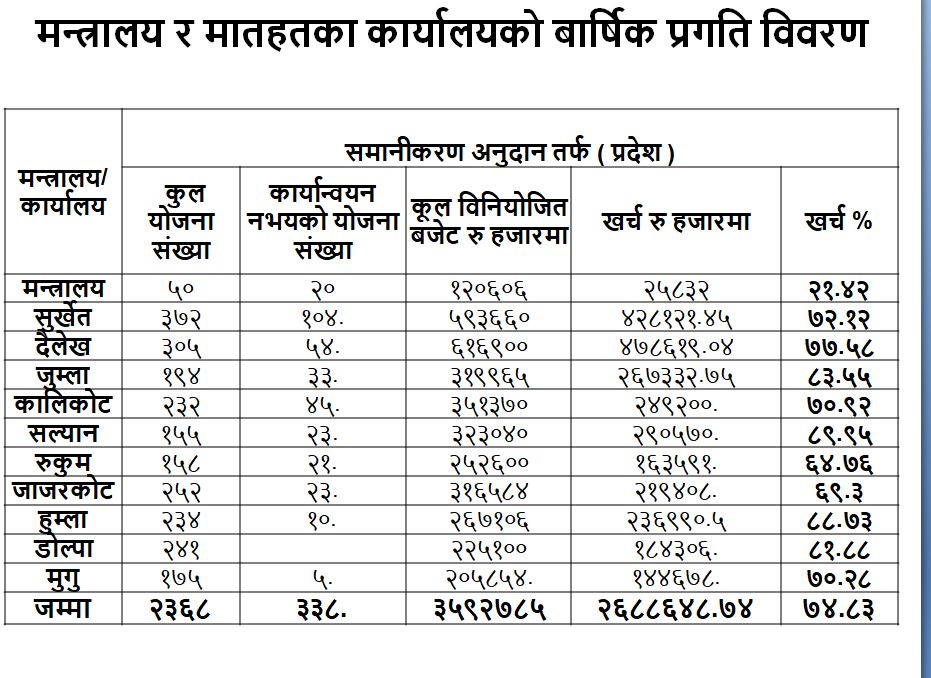 भूगोल सुहाउँदो कार्यालयको सांगठनिक संरचना पनि छैन । जसले मन्त्रालयका काम प्रभावित बनिरहेका छन् । कर्णालीका दश वटै जिल्लामा मन्त्रालय मातहतका कार्यालयहरू स्थापना गरिएका छन् । तर, त्यहाँ पनि जनशक्ति अपुग समस्या उस्तै छ । मन्त्रालय र मातहतका कार्यालयमा गरी जम्मा दुुई सय २२ जना कर्मचारीको स्थायी दरबन्दी छ । त्यसमध्ये दरबन्दीमा एक सय एक र १७ जना करारमा कार्यरत छन् । ८७ जना कर्मचारीको पद रिक्त रहेको छ ।