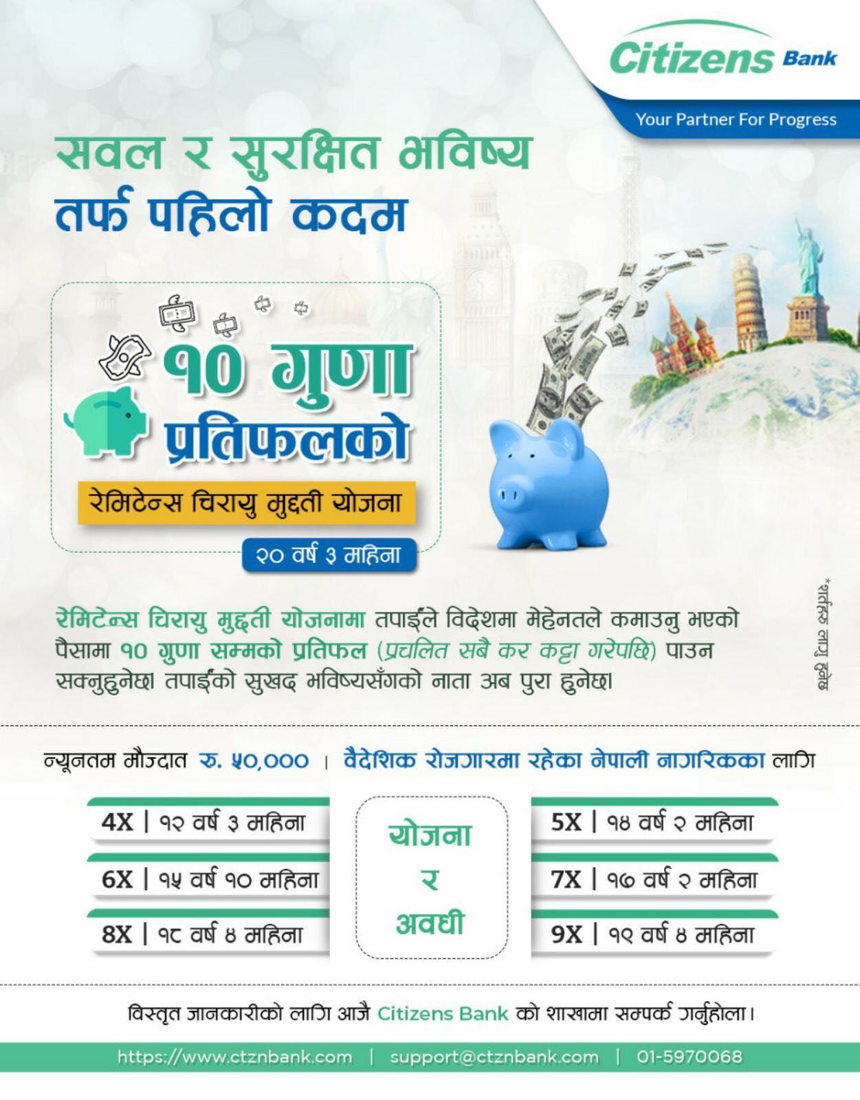 १० गुणा सम्म प्रतिफल प्राप्त हुने ‘सिटिजन्स चिरायु मुद्धती योजना तथा रेमिटेन्स चिरायु मुद्धती योजना’ संचालनमा