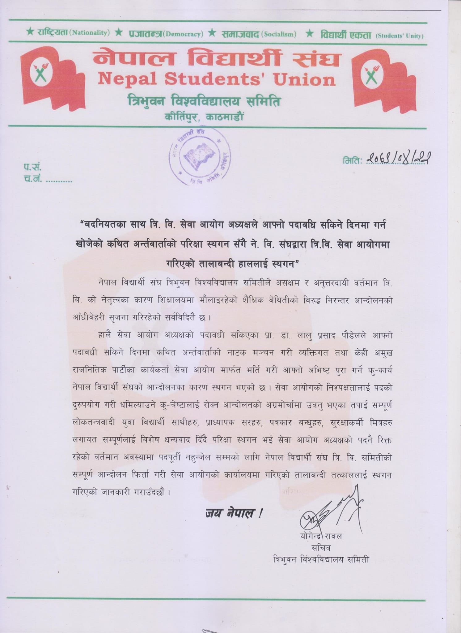 त्रिवि सेवा आयोगका अध्यक्षले आफ्नो पदावधी सकिने दिनमा गर्न खोजेको कथित अन्तरवार्ता परीक्षा स्थगनसँगै नेवि संघले आयोगमा गरिएको ताला खोलेको हो ।
