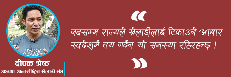 ‘नयाँ खेलाडीलाई टिकाउने आधार राज्य स्तरबाट बनाउनुपर्छ,’ राष्ट्रिय तथा अन्तर्राष्ट्रिय खेलाडी संघका अध्यक्ष समेत रहेका श्रेष्ठले भने, ‘राज्य स्तरबाट खेलाडीलाई टिकाउनका लागि उच्च स्तरबाट नै योजनाहरु बनाएको अवस्थामा खेलाडी पलायन रोक्न सकिन्छ ।’