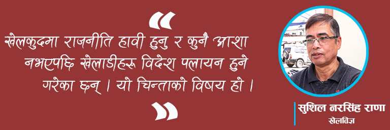 नेपाली खेलकुदलाई नियालिरहेका खेलविज्ञ सुशिल नरसिंह राणाले आशा नभएपछि खेलाडीले विकल्प खोज्नु बाध्यात्मक परिस्थिति रहेको बताउँछन् । खेलकुदमा राजनीति हावी हुनुले नकारात्मक असर परेको राणा सुनाउँछन् ।