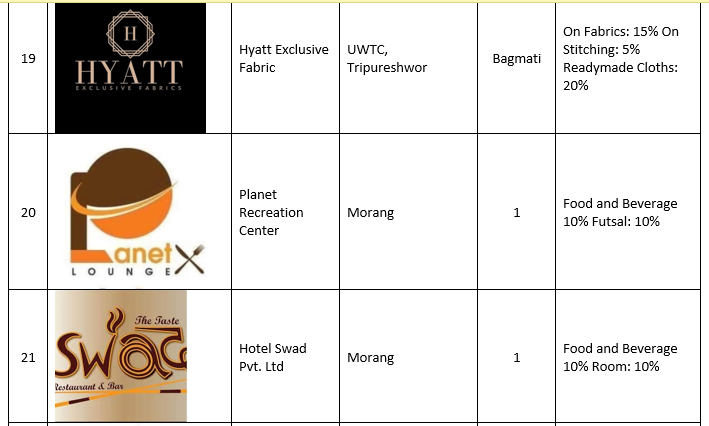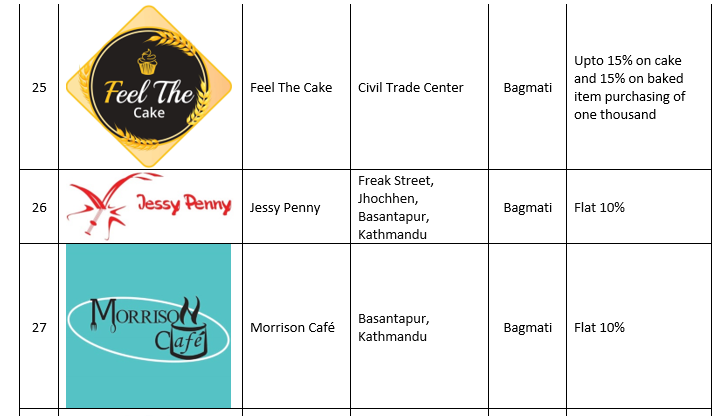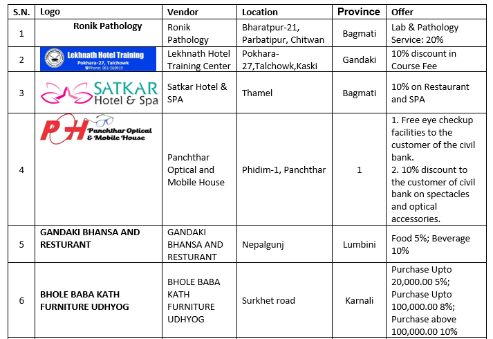 सिभिल बैंकका ग्राहकहरुले अब निम्न साझेदारहरुबाट विभिन्न वस्तु वा विभिन्न सेवा उपभोग गरी बैंकको विद्युतिय भुक्तानी प्रणाली ‘सिभिल स्मार्ट-मोबाइल बैंकिङ एप” अथवा एटियम कार्डकोप्रयोग गरी भुक्तानी गर्दा निम्न वमोजिमका आकर्षक छुटहरु पाउने व्यवस्था गरेको छ ।