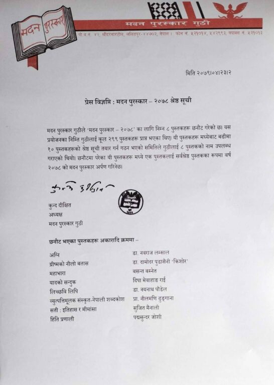 यिनै आठमध्ये एकलाई २०७८ को मदन पुरस्कार अर्पण गरिनेछ।