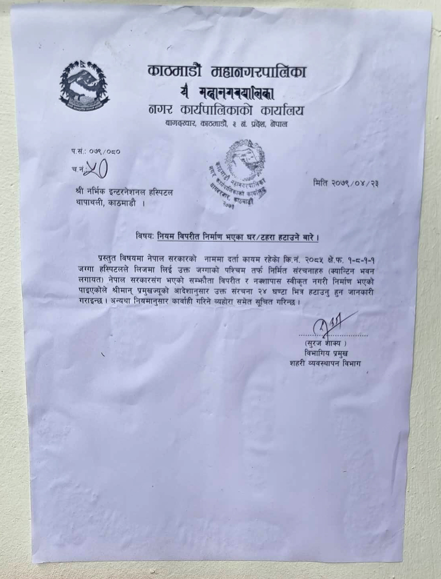 महानगरद्धारा जारी अल्टिमेटममा नियम उल्लंगन भएको जग्गाको पश्चिमतर्फ सम्झौता विपरीत र नक्सा पास नगरी घर टहरा बनाएकाले अस्पतालको चमेनागृह लगायतका भौतिक संरचना हटाउन भनिएको महानगरका विभागिय प्रमुख सुरज शाक्यद्धारा जारी पत्रमा उल्लेख गरिएको छ ।