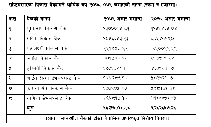 सञ्चालनमा रहेका १७ वटा विकास बैंकहरु मध्येमा ८ वटाले राष्ट्रियस्तरमा कारोबार सञ्चालन गर्दै आएका छन् । तीमध्ये आर्थिक वर्ष २०७८-०७९ मा सबैभन्दा बढी नाफा मुक्तिनाथ विकास बैंकले कमाएको छ । मुक्तिनाथले आव २०७८-०७९ मा एक अर्ब ३७ करोड २५ हजार रुपैयाँ खुद मुनाफा कमाउँदा गरिमाले एक अर्ब पाँच करोड ६६ लाख ५३ हजार रुपैयाँ खुद मुनाफा कमाएको छ ।