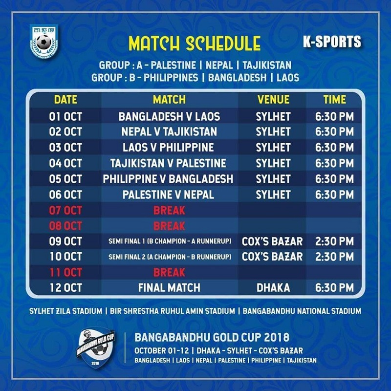 बंगलादेश फुटबल फेडेरेसनले सार्वजनिक गरेको खेल तालिका अनुसार नेपालले पहिलो खेलमा ताजकिस्तानको सामना गर्ने छ । समूह ‘ए’ मा रहेको नेपालले ताजकिस्तानसँग अक्टोबर २ मा तारिखमा खेल्ने खेल तालिका छ ।