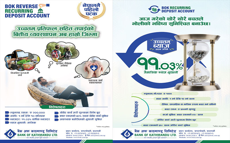 काठमाडौं । बैंक अफ काठमाण्डू लिमिटेडले ११.०३ प्रतिशतको उच्चतम ब्याजदर भएको बिओके रिकरिङ्ग र रिभर्स रिकरिङ्ग निक्षेप खाताहरु सार्वजनिक गरेको छ ।