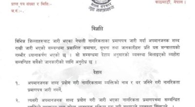 सोमबार मन्त्रालयले एक सूचना जारी गर्दै मन्त्रालयले अबमानजनक शब्द राखेर बनाइएका नागरिकता सच्याउन निर्देशन दिएको हो ।