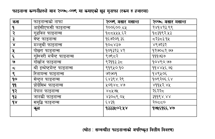 अपरिष्कृत वित्तीय विवरण अनुसार आव २०७८-०७९ मा आईसीएफसी, पोखरा, गुहेश्वरी मर्चेन्ट, गोर्खाज, श्री इन्भेष्टमेन्ट एण्ड फाइनान्स, सेन्ट्रल र समृद्धि सहितका ८ वटा फाइनान्स कम्पनीहरुको नाफा घटेको छ । त्यस्तै, गुडविल, बेष्ट, मञ्जुश्री, प्रोग्रेसिभ, नेपाल र जानकी सहितका ६ वटा फाइनान्सको खुद मुनाफा बढेको छ ।