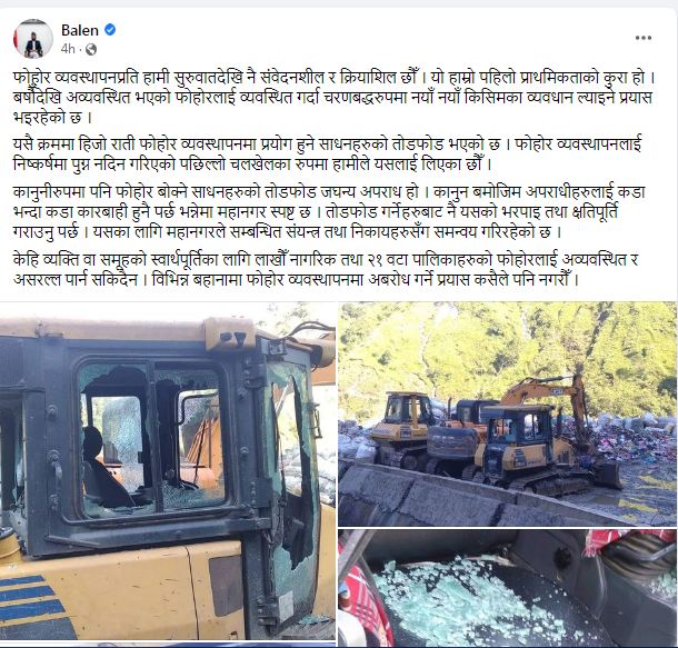 आज दिउँसो सामाजिक सञ्जाल फेसबुकमा लेख्दै महानगरप्रमुख बालेन्द्र शाह (बालेन)ले फोहोर व्यवस्थापनप्रति महानगर सुरुवातदेखि नै संवेदनशील र क्रियाशिल रहेको र यसलाई प्राथमिकतामा राखेर काम गर्दै आएको बताएका छन् ।