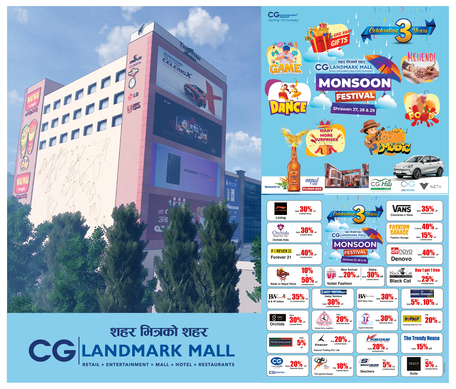 सहरभित्रको सहर नाराका साथ सञ्चालन भइरहेको सिजी ल्यान्डमार्कले तेस्रो वार्षिकोत्सवको अवसर पारेर मनसुन फेस्टिभ अफर पनि सार्वजनिक गरेको छ । पछिसम्म चल्ने मनसुन अफरअन्तर्गत मलमा सञ्चालित विभिन्न सामानका आउटलेटहरुले आकर्षक छुट दिनेछन् ।