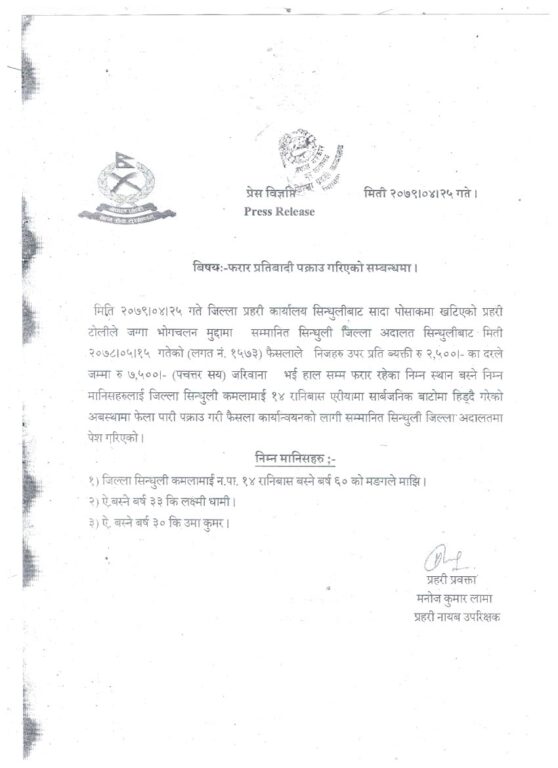 उनिहरुलाई जिल्ला प्रहरी कार्यालय सिन्धुलीबाट सादा पोसाकमा खटिएको प्रहरी टोलीले समातेको थियो । सिन्धुली जिल्ला अदालतको गत बर्षको भदौ १५ गते लगत नं. १५७३० फैसलाले प्रति ब्यक्ती २ हजार ५ सयका दरले जम्मा पचहत्तर सय जरिवाना गरिएको उनिहरु उक्त रकम नतिरि भागेका थिए ।
