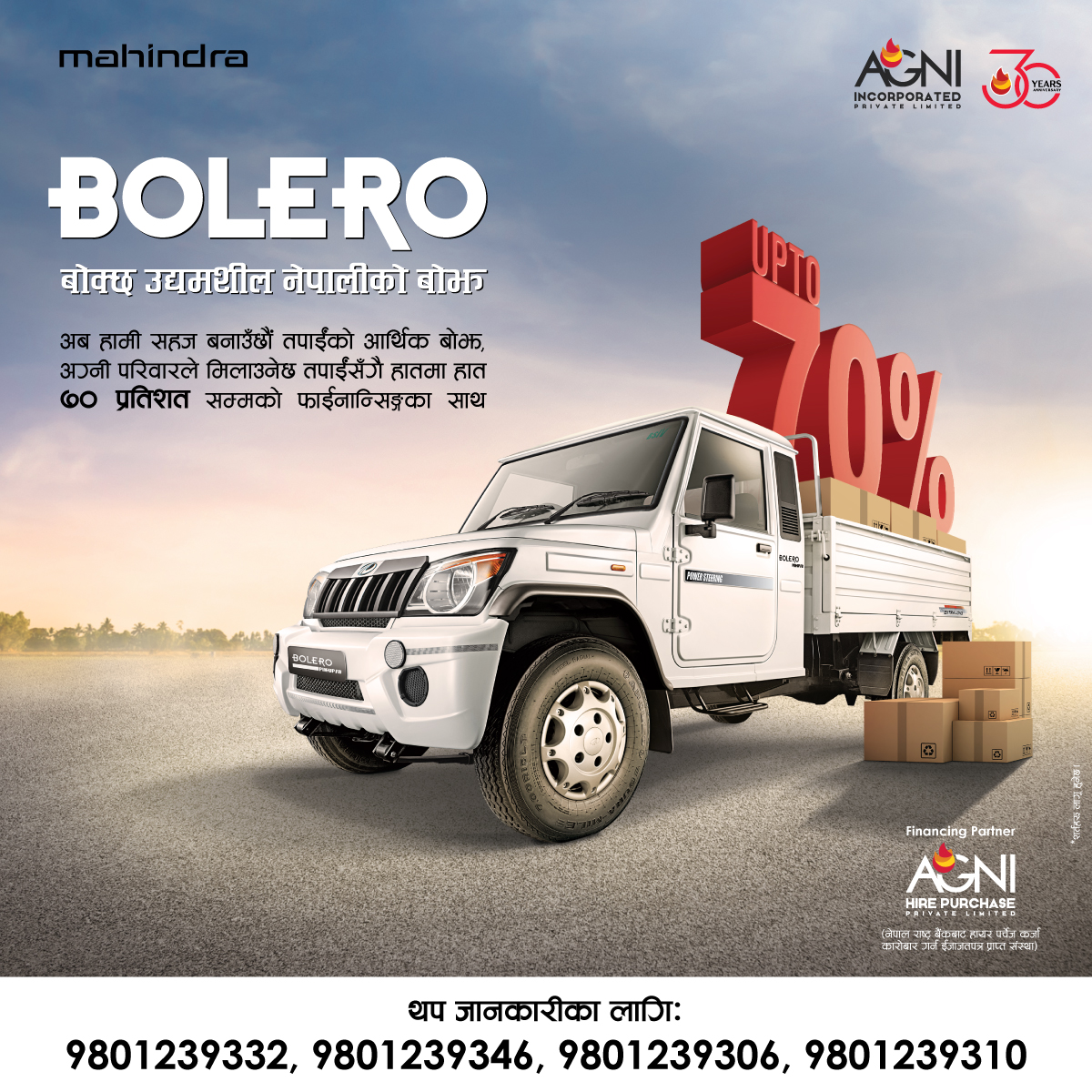 काठमाडौं । अग्नि इन्कर्पोरेटले आफ्ना महिन्द्रा स्कर्पियो र बोलेरो रेन्जका सवारी साधनमा पहिलो पटक ७० प्रतिशतसम्म फाइनान्सिङ स्किम ल्याएको छ । यो योजना ग्राहकहरूलाई राहत दिन र महिन्द्रा भेहिकलले विगतका वर्षहरूमा देखाएको उद्यमशीलताको भावनालाई सहयोग गर्ने प्रयास हो ।