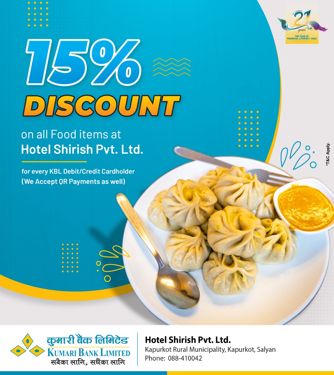 डिजिटल कारोबारमा ग्राहकहरू आकर्शित भाईरहेको कुरालाई मध्यनजर गर्दै आफ्नो डिजिटल कारोबारमा ग्राहकहरूलाई प्रोत्साहन गर्नका निमित्त कुमारी बैंकले यस सहकार्य मार्फत होटेल शिरीषका विभिन्न सेवाहरुमा आकर्षक छुटको प्रावधान गरेको हो । बैंकका डेबिट/क्रेडिट कार्डवाहकहरुले उक्त होटेलको सुविधा शुल्कमा १५ प्रतिशत सम्मको छुट प्राप्त गर्न सक्नेछन् ।
