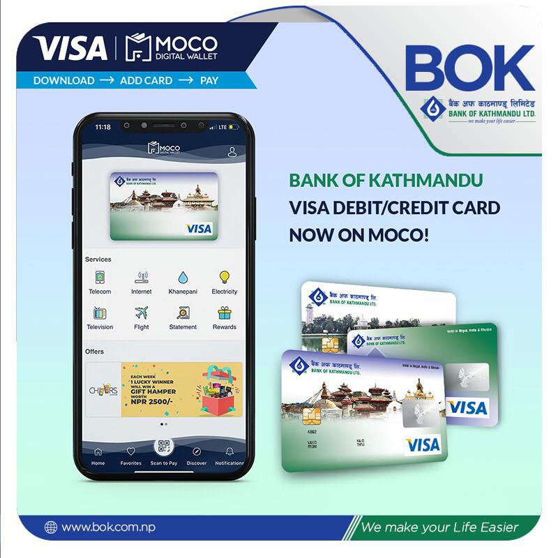 यस संगै बैंकका कार्डबाहकहरुले आफ्नो कार्डको प्रयोग गरी विभिन्न सेवाहरुको भुक्तानी तुरुन्तै गर्न सकिने छ । यस सेवाको प्रयोग गर्न ग्राहकहरुले मोको डिजिटल वालेटको एप गुगल प्लेस्टोर र एप स्टोरबाट डाउनलोड गरी आफ्नो बैंक अफ काठमाण्डूको डेबिट तथा क्रेडिट कार्ड लिंक गर्नुपर्ने छ ।
