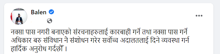 अदालतको आदेशपछि असन्तुष्ट बनेका बालेन फेसबुकमा लेख्छन्- ‘बरु नक्सा पास गर्ने अधिकार पनि सर्वोच्चलाई नै दिए हुन्छ’