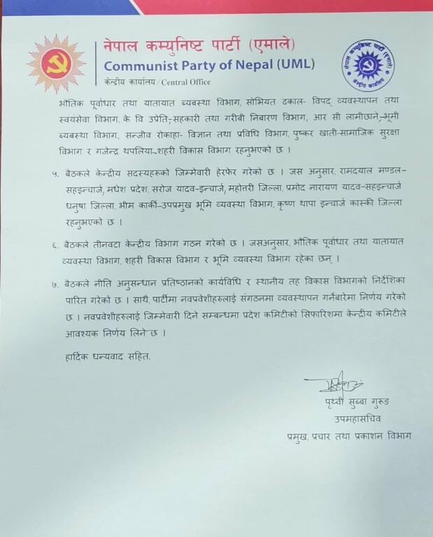 च्यासलस्थित पार्टी मुख्यालयमा बिहीबार बसेको केन्द्रीय सचिवालय बैठकले ओलीको नेतृत्वमा केन्द्रीय निर्वाचन परिचालन कमिटी गठन गरेको प्रचार विभाग प्रमुख पृथ्वीसुब्बा गुरुङले जानकारी दिए ।