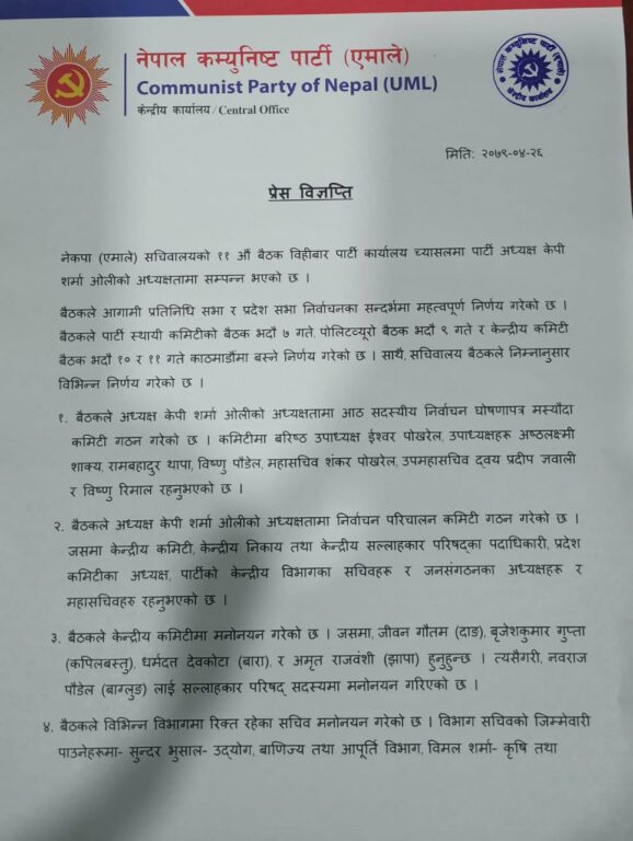 च्यासलस्थित पार्टी मुख्यालयमा बिहीबार बसेको केन्द्रीय सचिवालय बैठकले ओलीको नेतृत्वमा केन्द्रीय निर्वाचन परिचालन कमिटी गठन गरेको प्रचार विभाग प्रमुख पृथ्वीसुब्बा गुरुङले जानकारी दिए ।
