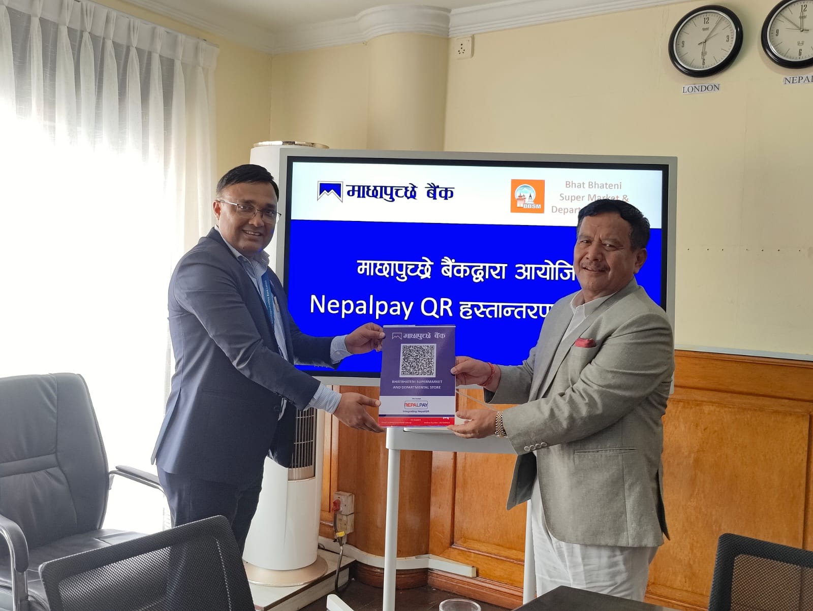 काठमाडौं । माछापुच्छ्रे बैंकले भाटभटेनी सुपरमार्केट तथा डिपार्टमेन्टल स्टोरलाई NCHL द्वारा प्रर्वद्धित Nepal Pay क्युआर कोड हस्तान्तरण गरेको छ । नगदरहित कारोबारलाई प्रर्वद्धन गर्ने तथा ग्राहक एवं व्यापारीलाई सहज डिजिटल बैंकिङ सेवाको पहुँच पुर्याउने लक्ष्यका साथ उक्त Nepal Pay क्यु.आर. सेवा भाटभटेनी सुपरमार्केट तथा डिपार्टमेन्टल स्टोरका अध्यक्ष मीन बहादुर गुरुङलाई एक औपचारिक कार्यक्रममा माछापुच्छ्र्रे बैंकका प्रमुख कार्यकारी अधिकृत सन्तोष कोइरालाबाट हस्तान्तरण गरिएको हो ।