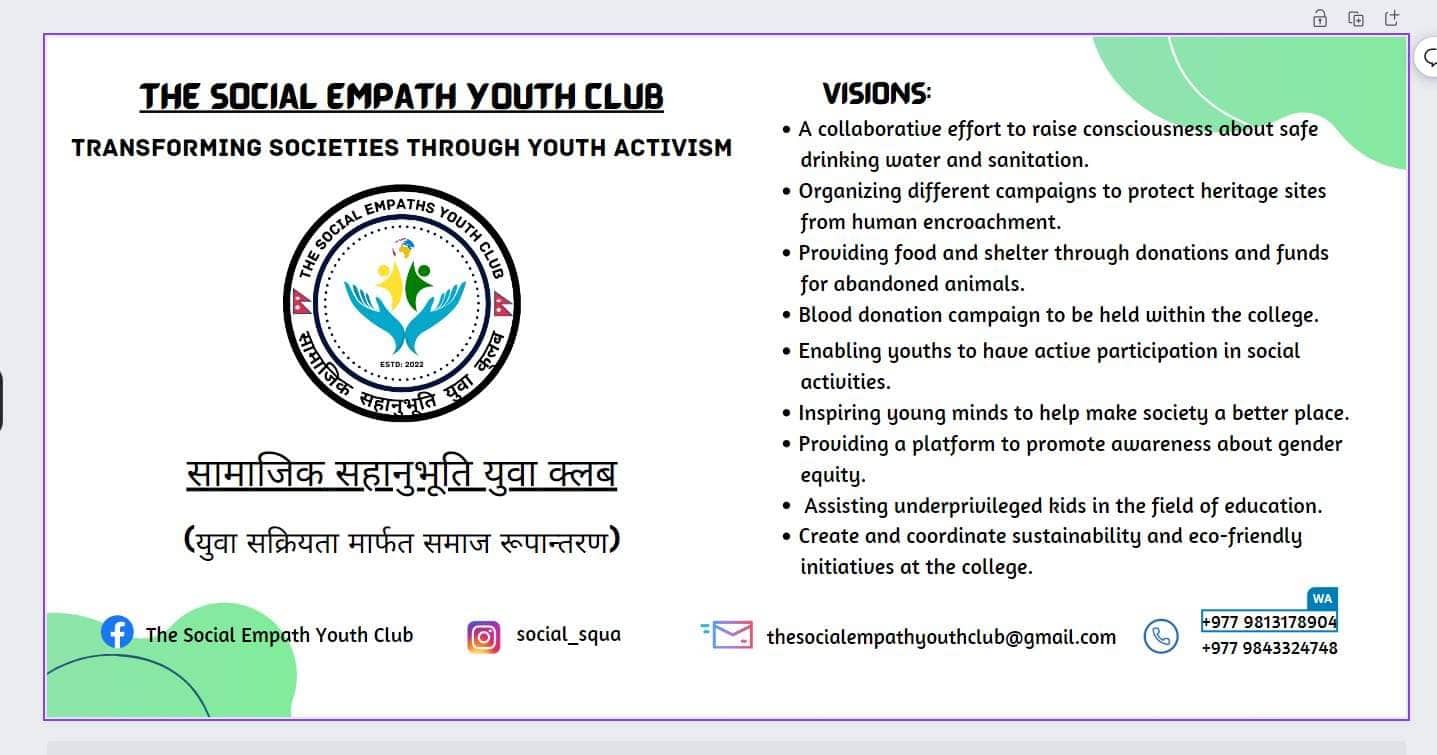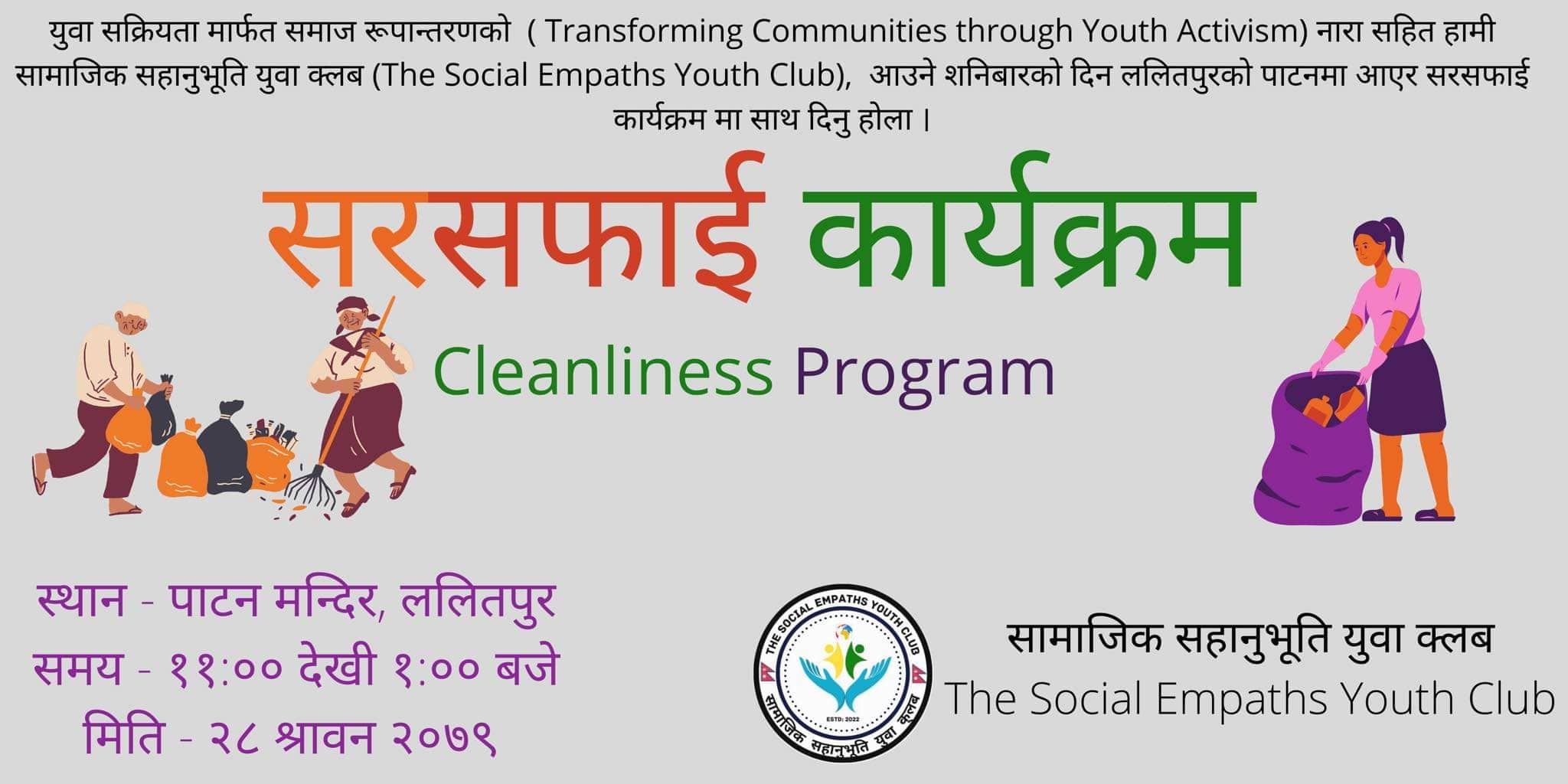 समाज रुपान्तरणका विभिन्न लक्ष्य र सपना बोकेको क्लबले सरसफाई कार्यक्रममा सहभागि हुनसमेत आग्रह गरेको छ ।