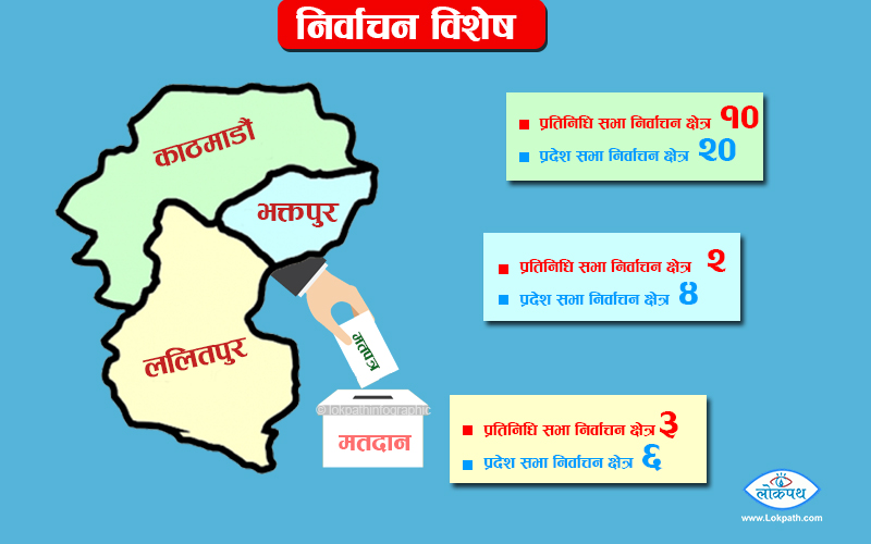 प्रतिनिधि सभाको १५ र प्रदेश सभाको ३० निर्वाचन क्षेत्र रहेको उपत्यकामा काठमाडौं जिल्लाले प्रतिनिधि र प्रदेश सभामा क्रमशः १५ र ३० जनालाई निर्वाचित गराउँछ । त्यस्तै ललितपुरले प्रतिनिधि सभामा ३ र प्रदेश सभामा ६ जनालाई चुनेर पठाउँछ भने भक्तपुर जिल्लाले प्रतिनिधि सभाको लागि २ जना र प्रदेश सभाको लागि ४ जनालाई आगामी पाँच वर्षको लागि आफ्नो जनप्रतिनिधिको रुपमा चुन्नेछ ।