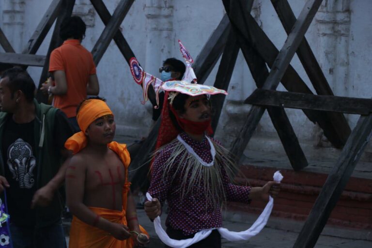 काठमाडौं । गाईजात्राको अवसरमा शनिबार काठमाडौंको वसन्तुपरमा मृतकहरूको सम्झनामा बालकलाई गाईको भेषधारण गरी बाजागासहित सहर परिक्रमा गराइँदै ।