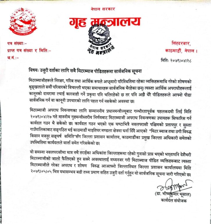 काठमाडौं । विशेषगरी तराईका जिल्लाहरूमा केही समययता मिटरब्यजका कारण पीडित हुनु परेको घटना सार्वजनिक भएको भन्दै गृह मन्त्रालयले आगामी ५ भदौभित्र त्यस्ता पीडितहरूलाई प्रमाणसहित प्रहरीमा उजुरी गर्न सूचना जारी गरेको छ ।