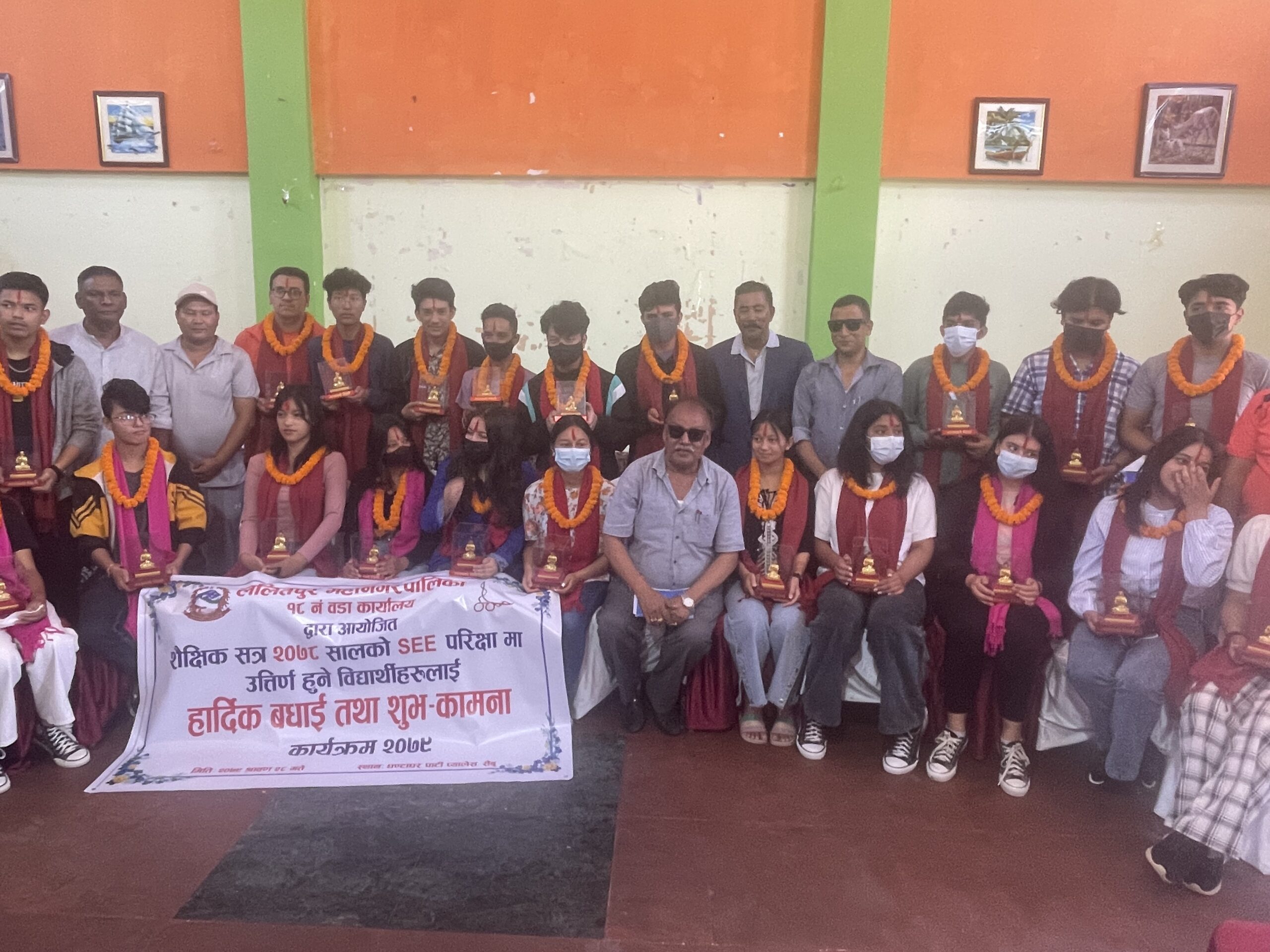ललितपुर । ललितपुर महानगरपालिका–१८ ले बिसं २०७८ सालको एसईई परीक्षा उतिर्ण २४ जना विद्यार्थीलाई सम्मान गरेको छ । सम्मानित हुनेमा सो वडामा स्थायी वसोबास गर्ने विद्यार्थी हुन । वडा अध्यक्ष दामोदर खड्का र सदस्यहरु राधिका रोक्का, गोपाल डंगोल र निरज कुँवरले सम्मान गर्नुभएको थियो ।