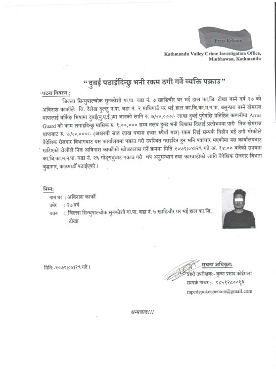 त्यस्तै, कार्कीले दैलेखको दुल्लु घर भएका एक पुरूषलाई वर्किङ भिषामा दुबई जानको लागि ७ लाख ५० हजार रूपैयाँ लाग्ने र दुबई पुगेपछि प्रतिष्ठित कम्पनीमा आर्मस् गार्डको काम लगाईदिन्छु, मासिक १ लाख रूपैयाँसम्म तलब हुन्छ भन्दै विश्वास दिलाएर प्रलोभनमा पारेको प्रहरीले जनाएको छ ।