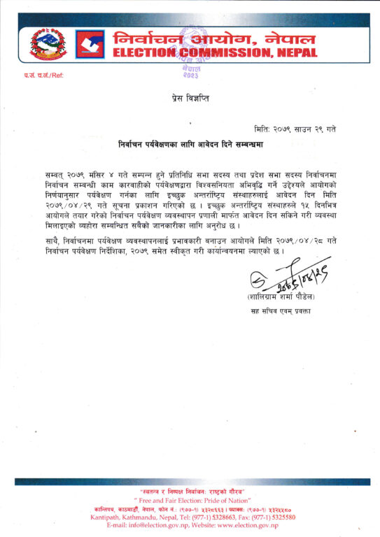 आज आइतबार एक विज्ञप्ति जारी गर्दै निर्वाचन सम्बन्धी काम कारवाहीको पर्यवेक्षणद्वारा विश्वसनियता अभिवृद्धि गर्ने उद्देश्यले आयोगको निर्णयानुसार यसका लागि इच्छुक अन्तर्राष्ट्रिय संस्थाहरुलाई आवेदन दिन भनिएको हो ।